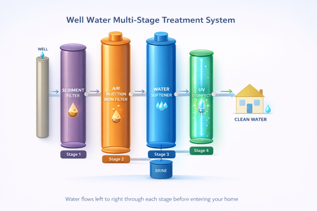 Unlike basic softener installations, well water treatment requires layered protection. Depending on your test results, your system may include: